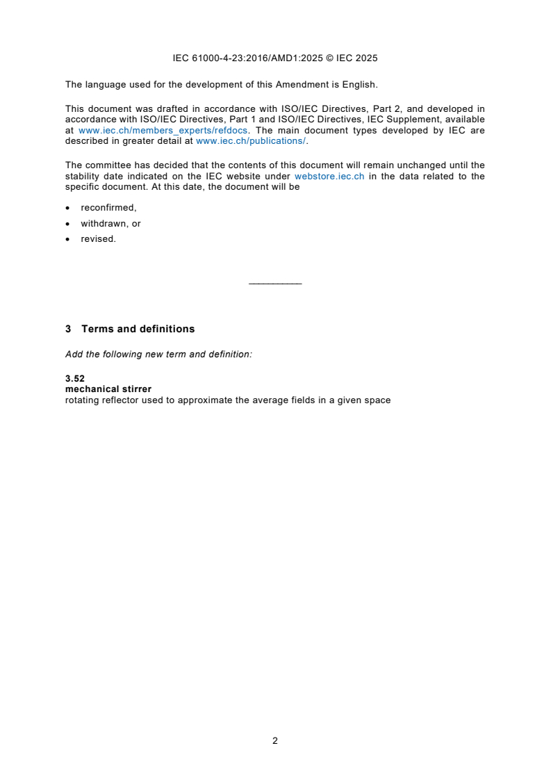 IEC 61000-4-23:2016/AMD1:2025 (Edition 2.0, Amendment 1) is an amendment to the IEC test methods for protective devices against HEMP (high-altitude electromagnetic pulse) and other radiated disturbances including IEMI (intentional electromagnetic interference). The amendment updates test procedures, adds definitions (for example mechanical stirrer - a rotating reflector used to approximate average fields), refines global-illumination requirements and introduces a new subclause for space-averaged transfer function measurements at frequencies above 1 GHz.
