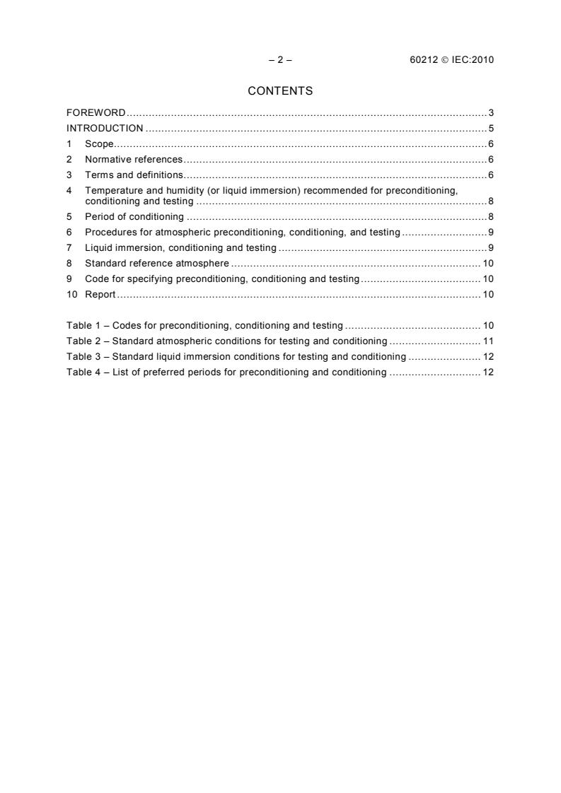 IEC 60212:2010 gives the accepted conditions of exposure time, temperature, atmospheric humidity and liquid immersion for use in testing solid electrical insulating materials. The range is sufficiently wide to enable suitable conditions to be selected so that either of the primary objects, set out below as a) and b), of conditioning can be achieved. These objectives aim to obtain greater reproducibility of test results by: