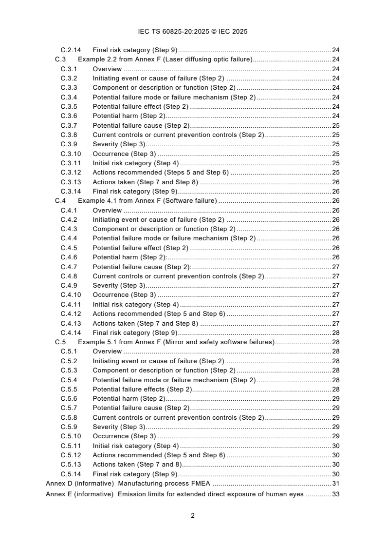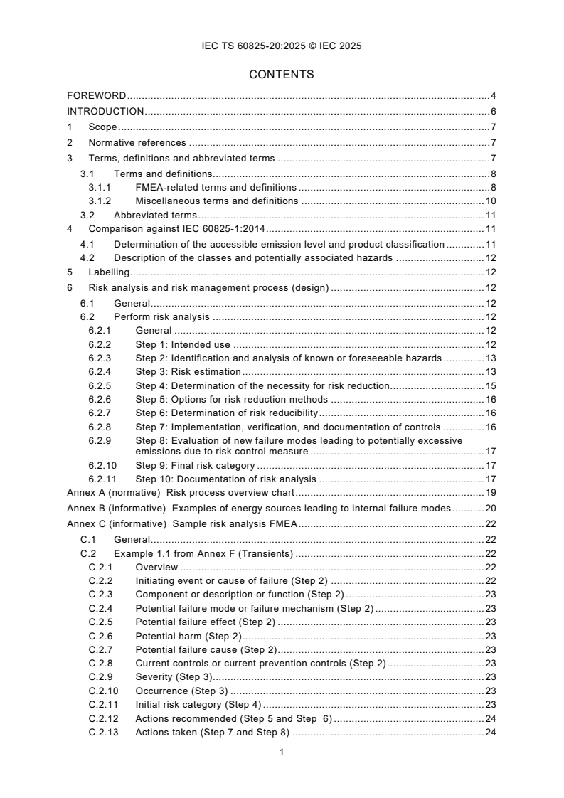 IEC TS 60825-20:2025 is a technical specification published by the International Electrotechnical Commission (IEC). Its full title is "Safety of laser products - Part 20: Safety requirements for products intentionally exposing face or eyes to laser radiation". This standard covers: IEC TS 60825-20:2025 provides radiation safety requirements (normative) and guidelines (informative) for the consideration of faults for Class 1 laser devices with laser radiation directed towards the eyes or face. Requirements for the safety of the nominal emission are not in the scope of this document. Examples: − devices with laser light facial or ocular recognition; − virtual reality headsets or glasses; − devices with gesture tracking via eye or facial movements; − driver surveillance cameras; − full body scanners (including eyes, face, and body). Products exempted from this document include: − medical and ophthalmic devices; − automotive (lidars), lamps; − laser applications where the laser is used in a professional (non-consumer) setting and is intended for direct or long-time exposure of the eyes or face. This document provides normative requirements and informative guidelines for: − radiation safety analysis; − production-line testing; − hazard analysis for laser radiation emissions (using a modified safety-focused FMEA approach) NOTE all subsequent references to FMEA in this document refers to this safety-focused FMEA approach. − examples of typical failure modes and mitigation techniques
