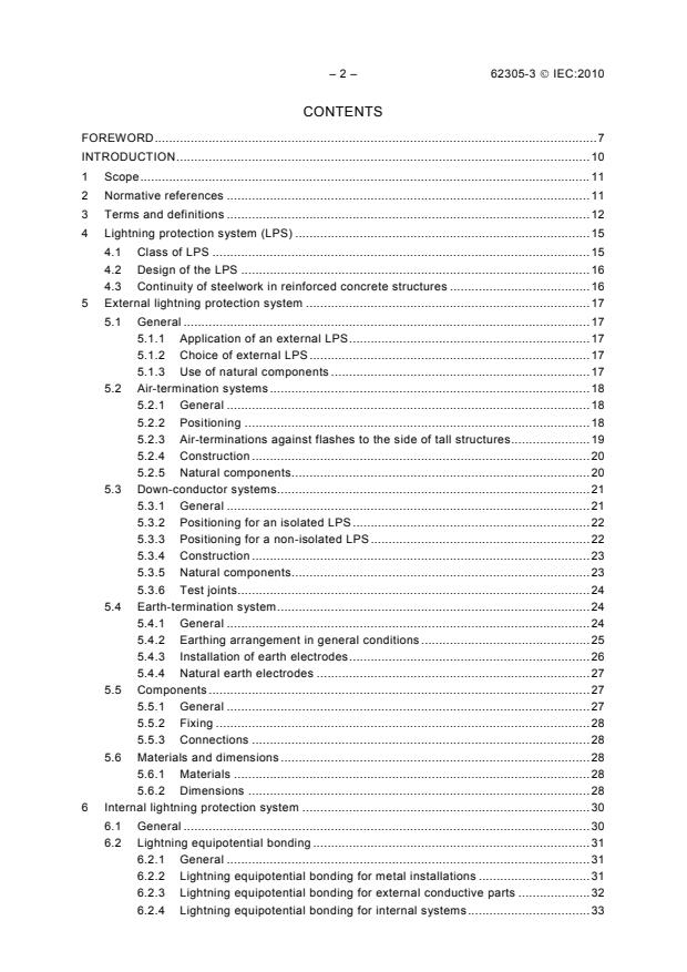 IEC 62305-3:2010 is a standard published by the International Electrotechnical Commission (IEC). Its full title is "Protection against lightning - Part 3: Physical damage to structures and life hazard". This standard covers: IEC 62305-3:2010 provides the requirements for protection of a structure against physical damage by means of a lightning protection system (LPS), and for protection against injury to living beings due to touch and step voltages in the vicinity of an LPS (see IEC 62305-1). This second edition cancels and replaces the first edition, published in 2006, and constitutes a technical revision. This edition includes the following significant technical changes with respect to the previous edition: 1) Minimum thicknesses of metal sheets or metal pipes given in Table 3 for air-termination systems are assumed as not able to prevent hot-spot problems. 2) Steel with electro-deposited copper is introduced as material suitable for LPS. 3) Some cross-sectional areas of LPS conductors were slightly modified. 4) For bonding purposes, isolating spark gaps are used for metal installations and SPD for internal systems. 5) Two methods simplified and detailed are provided for evaluation of separation distance. 6) Protection measures against injuries of living beings due to electric shock are considered also inside the structure. 7) Improved information for LPS in the case of structures with a risk of explosion are given in Annex D (normative). This bilingual version (2012-06) corresponds to the monolingual English version, published in 2010-12.