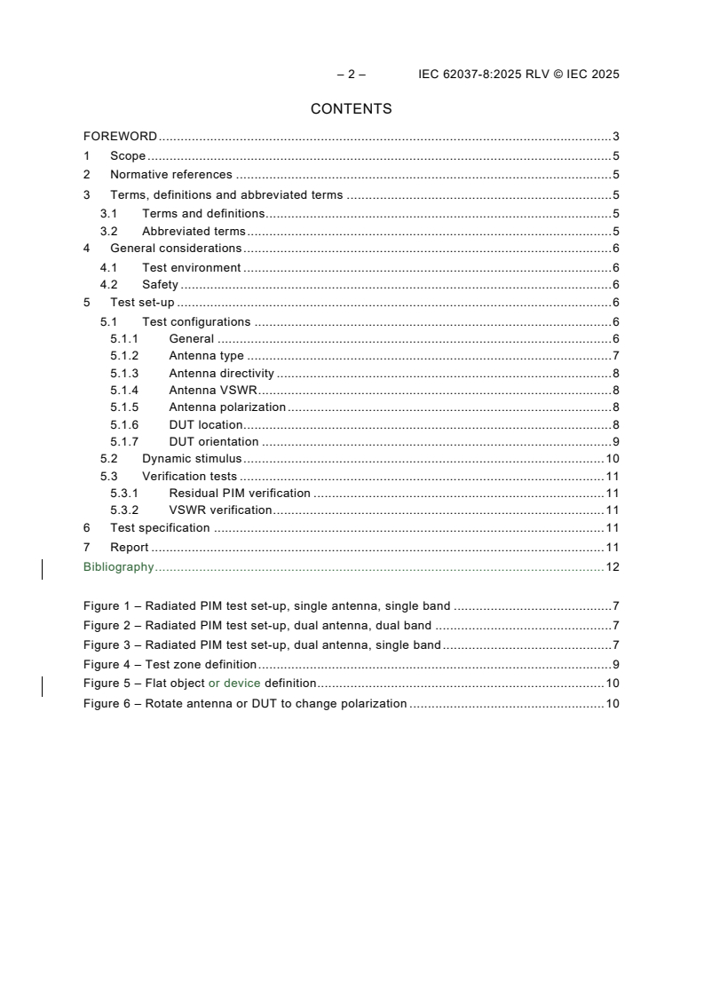 IEC 62037-8:2025 is a standard published by the International Electrotechnical Commission (IEC). Its full title is "Passive RF and microwave devices, intermodulation level measurement - Part 8: Measurement of passive intermodulation generated by objects exposed to RF radiation". This standard covers: IEC 62037-8:2025 defines a radiated passive intermodulation (PIM) test to determine PIM levels generated by a device or object when it is exposed to RF radiation. This test can be conducted on any material or object and is not limited to devices designed to propagate RF signals. This test can be conducted as either a near field or far field test as defined by the test specification in an outdoor test site or in an anechoic test chamber. This second edition cancels and replaces the first edition published in 2021. This edition constitutes a technical revision. This edition includes the following significant technical changes with respect to the previous edition: a) added safety warning to verify that transmitters are switched off before connecting or disconnecting any component; b) corrected formula for calculating directivity; c) corrected antenna orientation labels in Figure 6; d) added clarification that PIM tests reports shall include maximum PIM and VSWR values.
