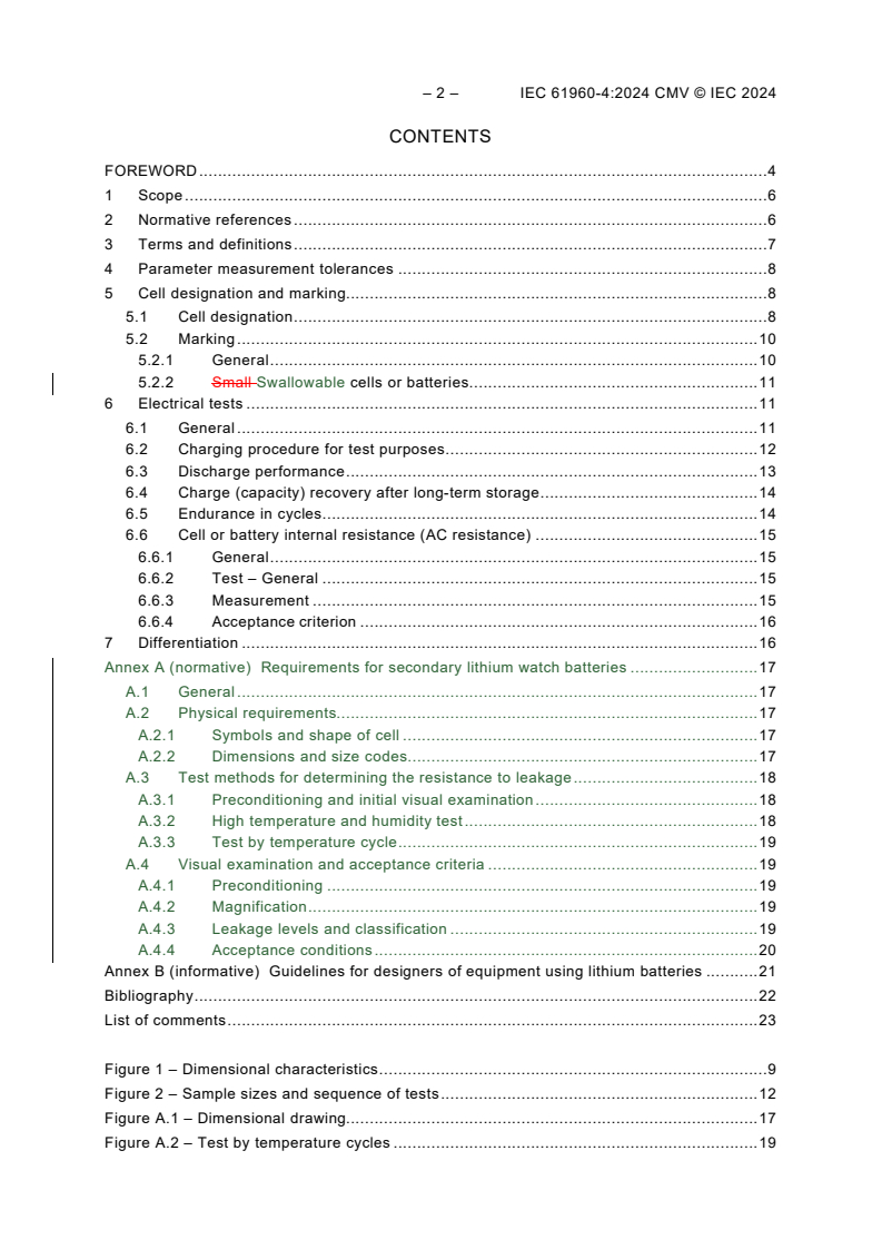 REDLINE IEC 61960-4:2024 CMV - Secondary cells and batteries containing alkaline or other non-acid electrolytes - Secondary lithium cells and batteries for portable applications - Part 4: Coin secondary lithium cells, and batteries made from them Released:30. 07. 2024 Isbn:9782832295038