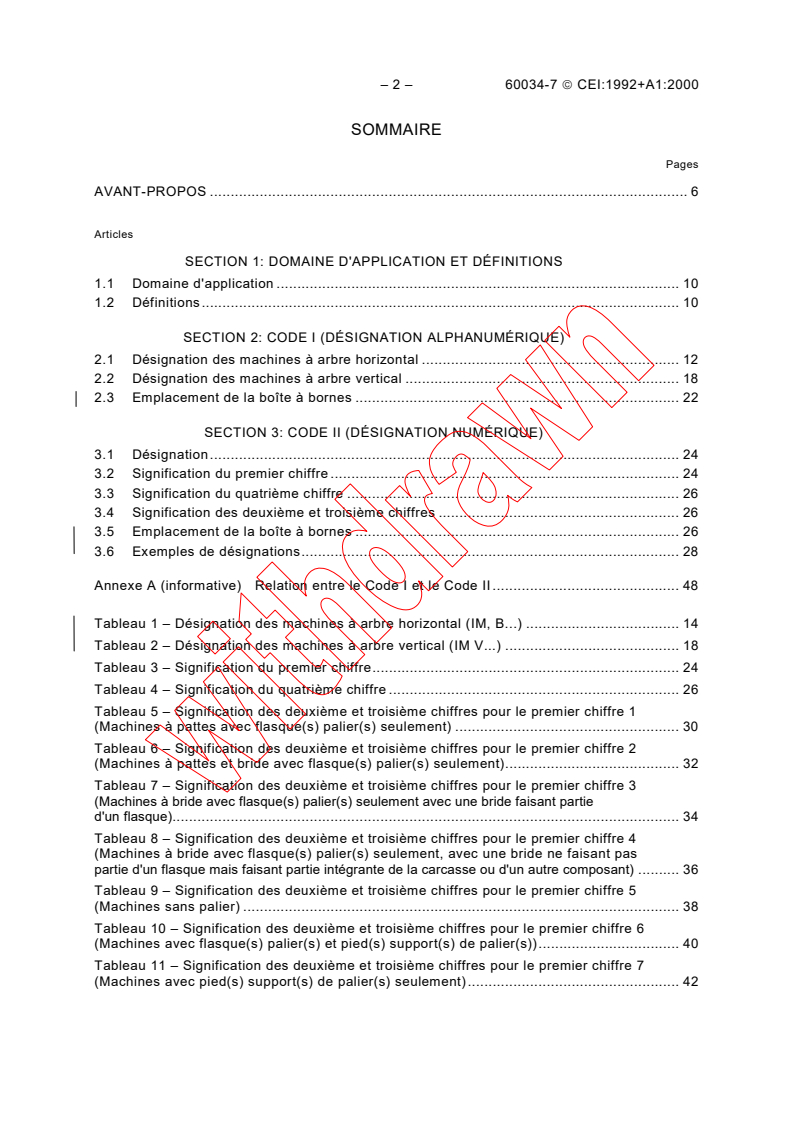 IEC 60034-7:1992 is a standard published by the International Electrotechnical Commission (IEC). Its full title is "Rotating electrical machines - Part 7: Classification of types of constructions and mounting arrangements (IM Code)". This standard covers: Gives two systems of classification: an alpha-numeric designation applicable to machines with endshield bearings and only one shaft extension (code I) and an all-numeric designation applicable to a wide range of types of machines (code II) including types covered by code I.