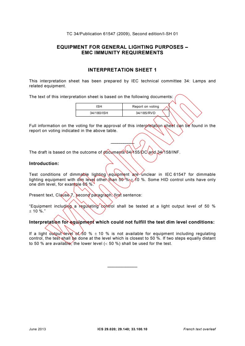 IEC 61547:2009 is a standard published by the International Electrotechnical Commission (IEC). Its full title is "Equipment for general lighting purposes - EMC immunity requirements". This standard covers: IEC 61547:2009 for electromagnetic immunity requirements applies to lighting equipment which is within the scope of IEC Technical Committee 34, such as lamps, auxiliaries and luminaires, intended either for connecting to a low voltage electricity supply or for battery operation. Excluded from the scope of this standard is equipment for which the immunity requirements are formulated in other IEC or CISPR standards. The main reason for this revision is to update the dates of the references to the basic standards which also required some editorial changes in the tables. The contents of the corrigendum of April 2010 and Interpretation Sheet 1 of June 2013 have been included in this copy.