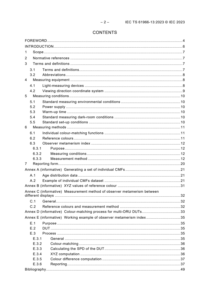 Keywords: IEC TS 61966-13:2023, observer metamerism, colour measurement, spectral power distribution, display calibration, colour‑matching functions, spectroradiometer, dark‑room conditions.