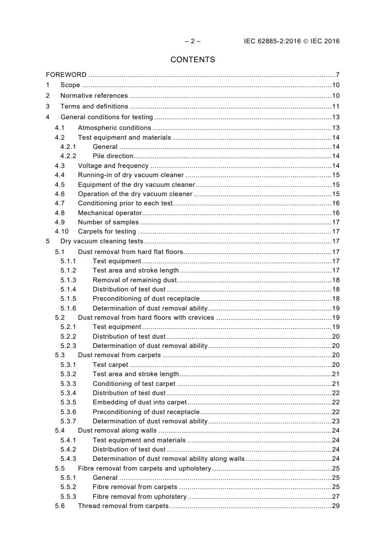 IEC 62885-2:2016 is a standard published by the International Electrotechnical Commission (IEC). Its full title is "Surface cleaning appliances - Part 2: Dry vacuum cleaners for household or similar use - Methods for measuring the performance". This standard covers: IEC 62885-2:2016 is applicable for measurements of the performance of dry vacuum cleaners for household use in or under conditions similar to those in households. The purpose of this standard is to specify essential performance characteristics of dry vacuum cleaners which are of interest to users and to describe methods for measuring these characteristics. This standard is not intended for cordless vacuum cleaners. For safety requirements, reference is made to IEC 60335-1 and IEC 60335-2-2. This first edition of IEC 62885-2 cancels and replaces IEC 60312-1:2010 and Amendment 1:2011. This edition constitutes a technical revision. This edition includes the following significant technical changes with respect to IEC 60312-1:2010+AMD1:2011. a) New terms and definitions have been added in Clause 3. b) Subclauses 4.2 and 4.6 have been improved for better understanding. c) Subclause 4.10 has been reviewed and renamed "Carpets for testing". d) Subclause 5.1.6 has been improved. e) Figure 1 in 5.4.1 has been improved. f) Subclause 5.5.3.3 has been improved. g) Subclauses of 5.7 have been renumbered. h) Subclause 5.7.3, previously 5.7.2, has been improved. i) Subclause 5.8.2 has been improved and renamed. j) The test method in 5.9.2.3 has been updated. k) A new subclause 5.10 on total emissions while vacuum cleaning has been included. l) The method in 5.11.6 has been improved. m) Subclause 6.10 has been renamed "Ability to maintain air flow performance". n) Subclauses of 6.16 have been renumbered. o) Subclause 6.16.2, previously 6.16.1, has been improved. p) New subclauses 6.16.3.5, 6.16.3.6 and 6.16.3.7 have been added. q) New subclauses 6.17 on operational motor life-time test and 6.18 on rated input power have been added. r) A new paragraph has been added in 7.2.1.5. s) In 7.3.2, the insert has been changed to aluminium. t) A new subclause 7.3.14 on total emissions test has been added. u) New Annexes D and E have been added.