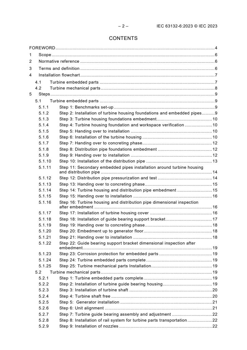 This standard is applicable to typical installations but allows for adaptability depending on factors such as turbine size, design variations, powerhouse layout, and component delivery schedules. The document provides a systematic flowchart and detailed step-by-step instructions covering embedded and mechanical parts of the turbine installation.