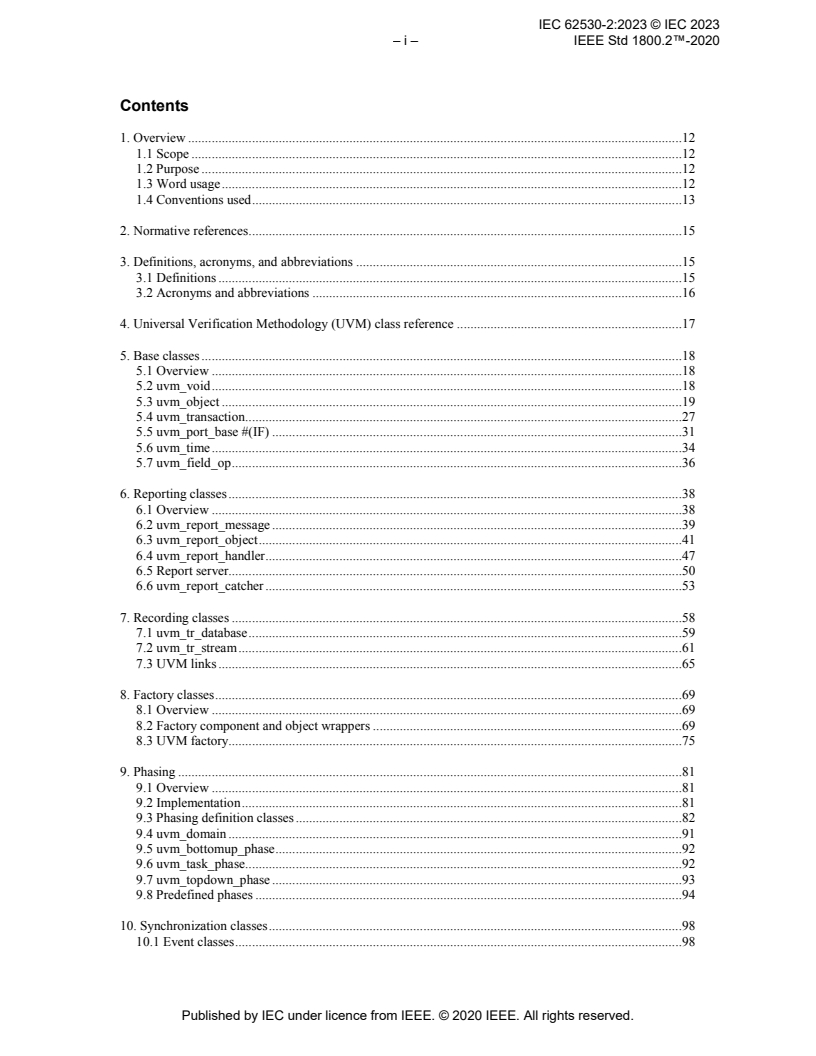 The standard provides a detailed class and API reference for UVM. Major technical topics include: