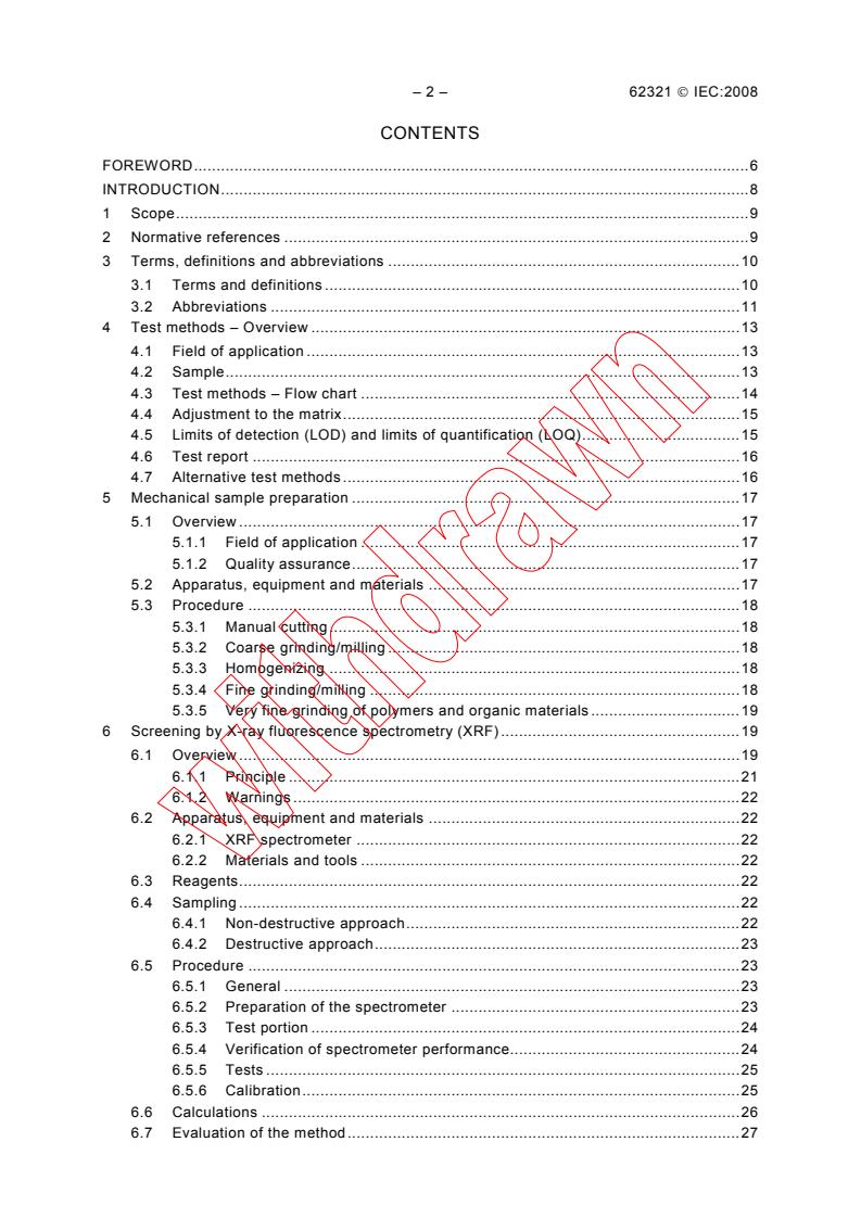 La CEI 62321:2008, qui est une Norme internationale, spécifie la détermination des niveaux de plomb (Pb), de mercure (Hg), de cadmium (Cd), de chrome hexavalent (Cr(VI)) contenus dans des composés inorganiques et organiques, ainsi que de deux types de retardateurs de flammes bromés, diphényles polybromés (PBB) et diphényles éthers polybromés (PBDE) contenus dans les produits électrotechniques. Cette norme fait référence à l'échantillon comme étant l'objet à traiter et à mesurer. L'entité qui réalise les essais définit la nature de l'échantillon et la manière de l'obtenir, et non pas la présente norme. Elle a le statut de norme horizontale conformément au Guide IEC 108.