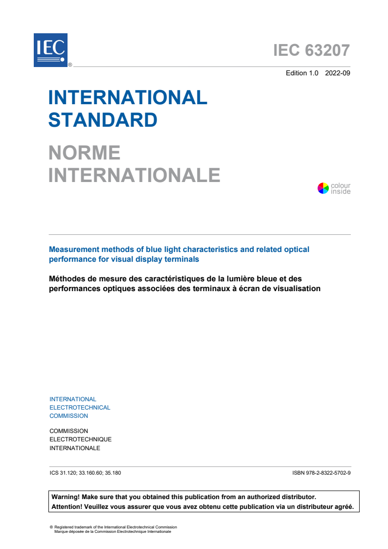IEC 63207:2022 is a standard published by the International Electrotechnical Commission (IEC). Its full title is "Measurement methods of blue light characteristics and related optical performance for visual display terminals". This standard covers: IEC 63207:2022 specifies measurement methods for optical performance (luminance) and blue light characteristics (BLCs) of visual display terminals (VDTs), excluding displays for outdoor use only.