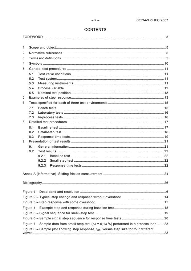 IEC 60534-9:2007 is a standard published by the International Electrotechnical Commission (IEC). Its full title is "Industrial-process control valves - Part 9: Test procedure for response measurements from step inputs". This standard covers: It defines the testing and reporting of the step response of control valves that are used in throttling closed-loop control applications. A control valve consists of the complete, ready-to-use assembly of the control valve body, the actuator, and any required accessories. The most probable accessory is a valve positioner. It defines how to test, measure, and report control valve response characteristics in an open-loop environment. This information can be used for process control applications to determine how well and how fast the control valve responds to the control valve input signal. The contents of the corrigendum of June 2008 have been included in this copy.