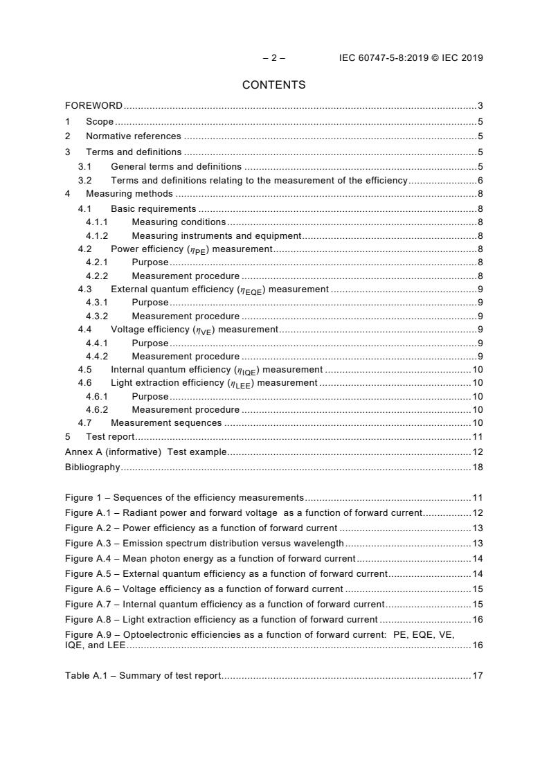 IEC 60747-5-8:2019 specifies the terminology and the measuring methods of various efficiencies of single light emitting diode (LED) chips or packages without phosphor. White LEDs for lighting applications are out of the scope of this part of IEC 60747. The efficiencies whose measuring methods are defined in this part are the power efficiency (PE), the external quantum efficiency (EQE), the voltage efficiency (VE), and the light extraction efficiency (LEE). To measure the LEE, the measurement data of the internal quantum efficiency (IQE) is used, whose measuring method is discussed in IEC 60747-5-9 and IEC 60747-5-10. The injection efficiency (IE) and the radiative efficiency (RE) are given definitions only.