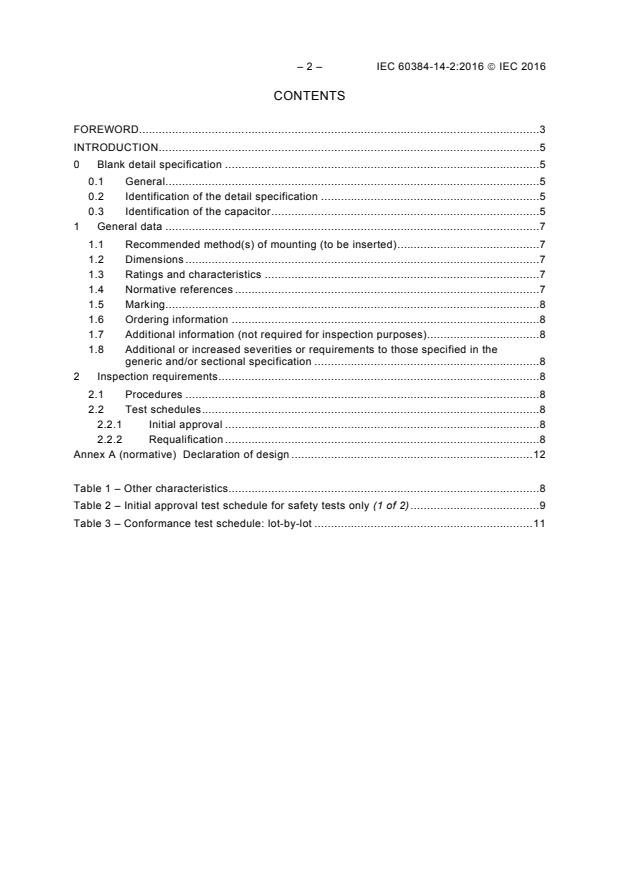 IEC 60384-14-2:2016은 전자 장비에서 사용되는 고정 커패시터에 대한 안전 테스트를 규정하는 표준이다. 이 표준은 일관된 국제 안전 표시 절차를 정의하고, 안전과 관련된 매개변수에 대한 디자인 선언을 요구한다. 또한, 커패시터의 각 로트가 출시되기 전에 준수 테스트를 수행해야 한다. 이번 판은 비준하는 항목들에 대한 허용되는 비준하지 않은 항목의 수에 대한 변화를 포함하고 있다. 이 표준은 IEC 60384-1:2016과 함께 읽어야 한다.