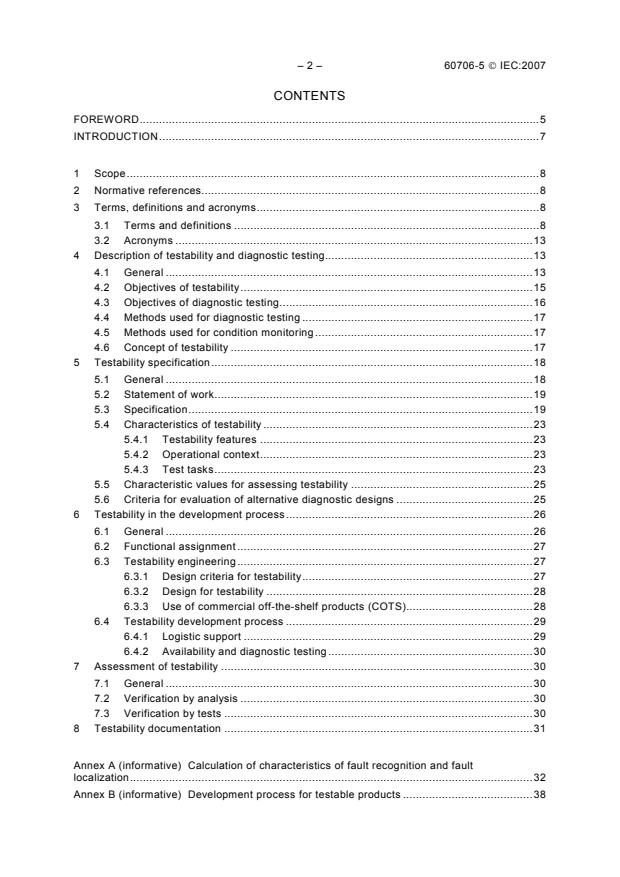 IEC 60706-5:2007 is a standard published by the International Electrotechnical Commission (IEC). Its full title is "Maintainability of equipment - Part 5: Testability and diagnostic testing". This standard covers: This guide has for purpose to provide guidance for the early consideration of testability aspects in design and development, and to assist in determining effective test procedures as an integral part of operation and maintenance. This second edition constitutes a technical revision. It expands and provides more detail on the techniques and systems broadly outlined in the first edition.