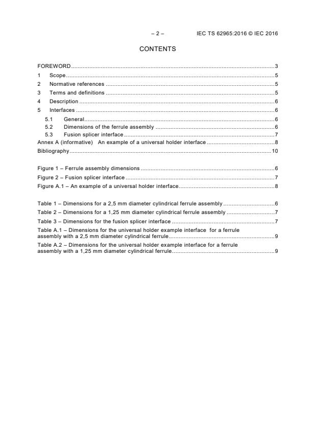 Keywords: IEC TS 62965, fusion splice on connector (FSOC), ferrule assembly dimensions, fusion splicer interface, fiber optic interconnection, fusion splicing tools, fiber optic connectors, universal holder, optical fiber termination, standardized dimensions, fiber optic passive components.