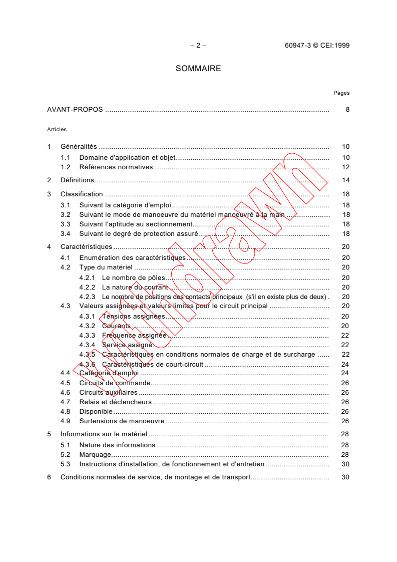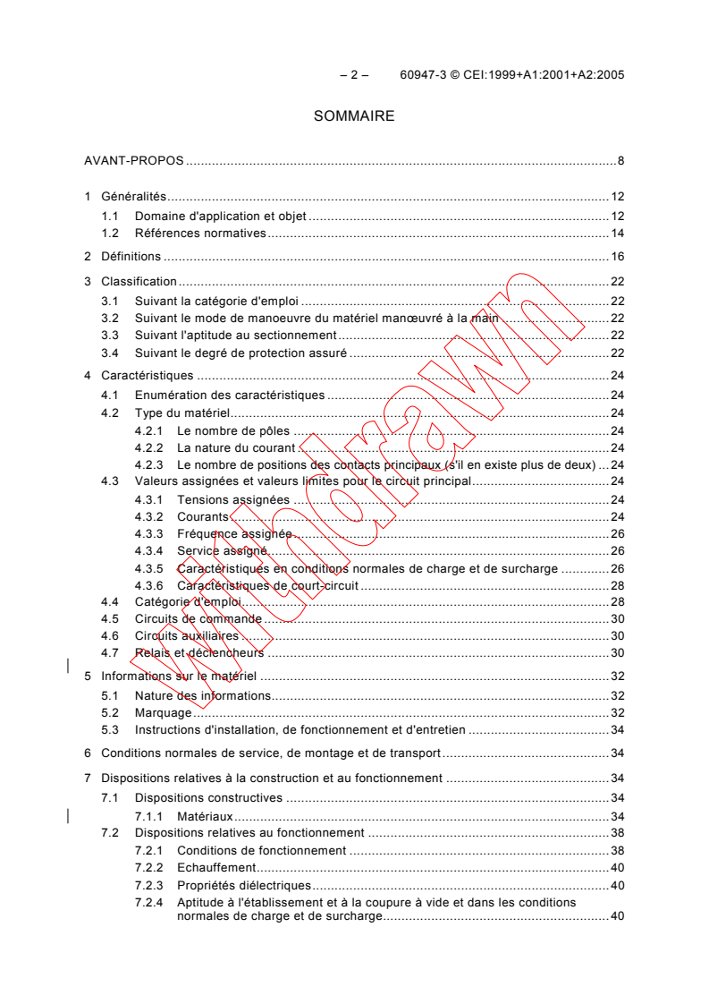 Fixe les caractéristiques du matériel, les conditions auxquelles doit répondre le matériel, fonctionnement et comportement en service normal, fonctionnement et comportement en cas de conditions anormales spécifiées, qualités diélectriques, les essais destinés à vérifier si ces conditions sont remplies et les méthodes à adopter pour ces essais, les indications à porter sur le matériel, ou celles fournies par le constructeur, par exemple dans le catalogue. Cette publication remplace la CEI 60408 (1985) et doit être utilisée conjointement avec la CEI 60947-1 (1988).
