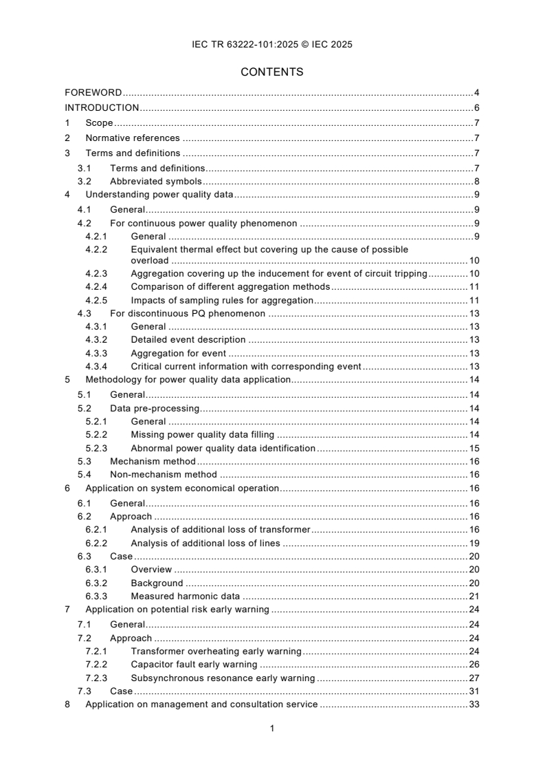 IEC TR 63222-101:2025 aims to provide guidelines for power quality data applications on different aspects in public power supply systems at voltage ranges from LV, MV and HV with 50 Hz or 60 Hz rated frequency. It intends to provide a methodology for mining hidden knowledge and support power quality management based on PQ data analytics. Its primary goal is to serve different aspects of power system to promote the system maintaining its normal state and improve efficiency. It can also help avoid unexpected system events, equipment malfunction/maloperation, and production process interruption. The various methodologies and methods mentioned in this document are optional.