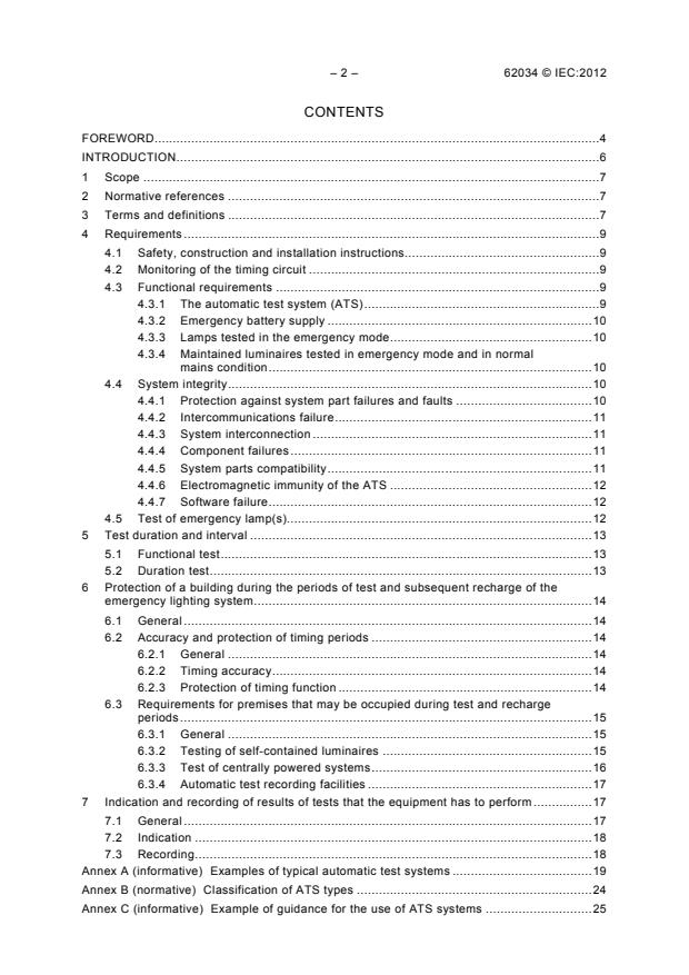 IEC 62034:2012 specifies the basic performance and safety requirements for individual products and components that are incorporated into automatic test systems for use with emergency lighting systems on supply voltages not exceeding 1 000 V. This second edition cancels and replaces the first edition published in 2006. It constitutes a technical revision. The main changes with respect to the first edition are the improvement of the understanding of the requirements in the various clauses and the compliance requirements listed below and the updating of the normative references.