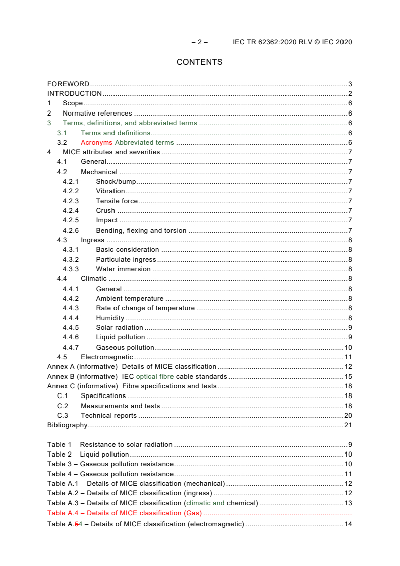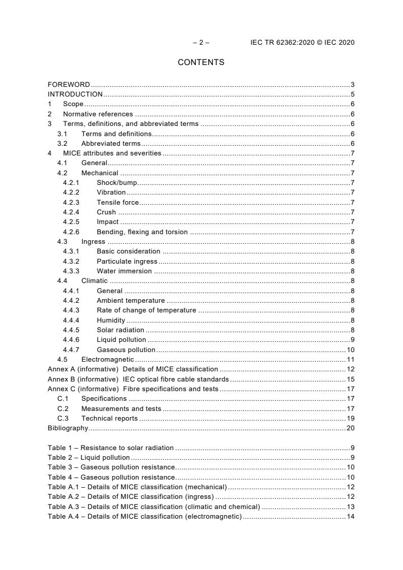 IEC/TR 62362: 2020 which is a technical report, provides information on the specification of optical fibre cables with respect to the mechanical, ingress, climatic and chemical or electromagnetic characteristics (MICE) as classified in ISO/IEC 11801-1. In this classification system, each letter of the four initials of the acronym are subscripted with a value from one to three to indicate different severities. The current attributes and severities are found in Annex A. This second edition cancels and replaces the first edition published in 2010. It constitutes a technical revision. This edition includes the following significant technical changes with respect to the previous edition: