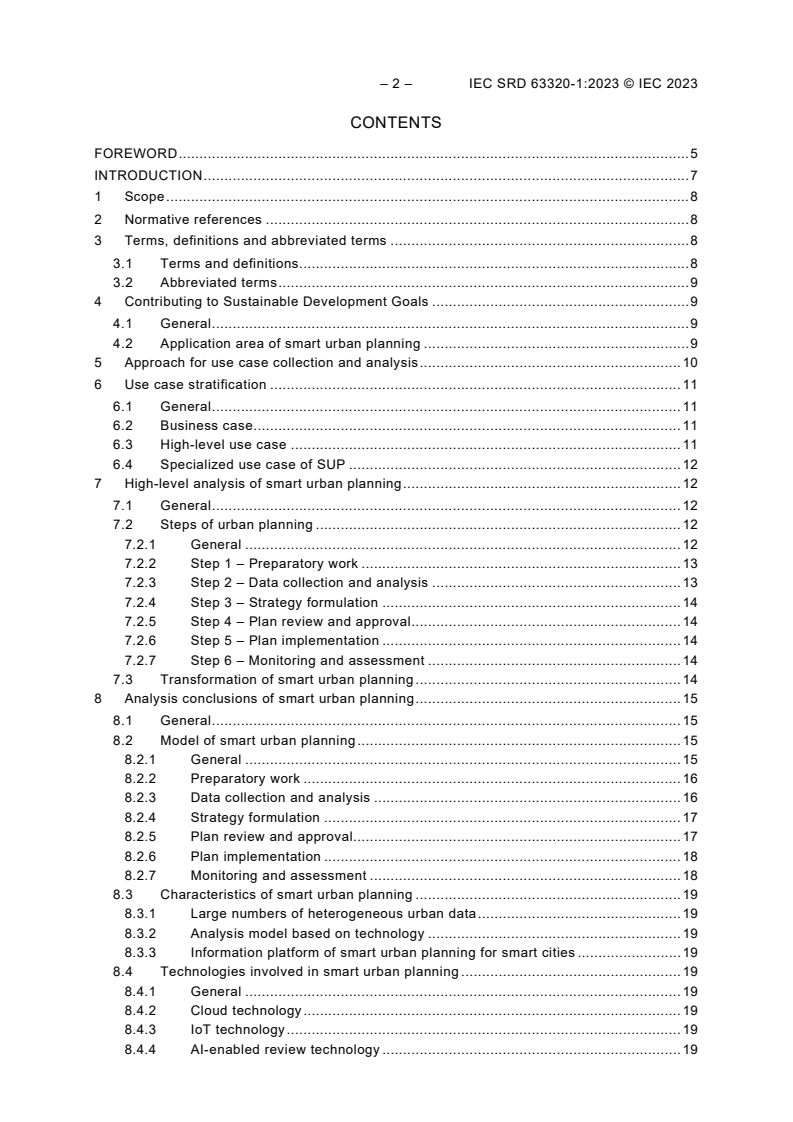 IEC SRD 63320-1:2023 In recent years, research on the relationship between information and communication technology (ICT) and cities, focused on imagining the future of urban planning, has been one of the most interesting topics in the industry. Smart urban planning (SUP) for smart cities is a relatively new concept and has not received much attention around the world. The “smartness” of urban planning describes the intensive use of digital technologies to optimize the urban planning process. The concept of "smart city" has been implemented and developed all over the world. In order to construct a smart city successfully, knowing how to implement SUP for smart cities is essential, because it is the foundation of smart urban construction. However, at present, reaching a consensus on the overall architecture of standards of SUP for smart cities is still challenging.