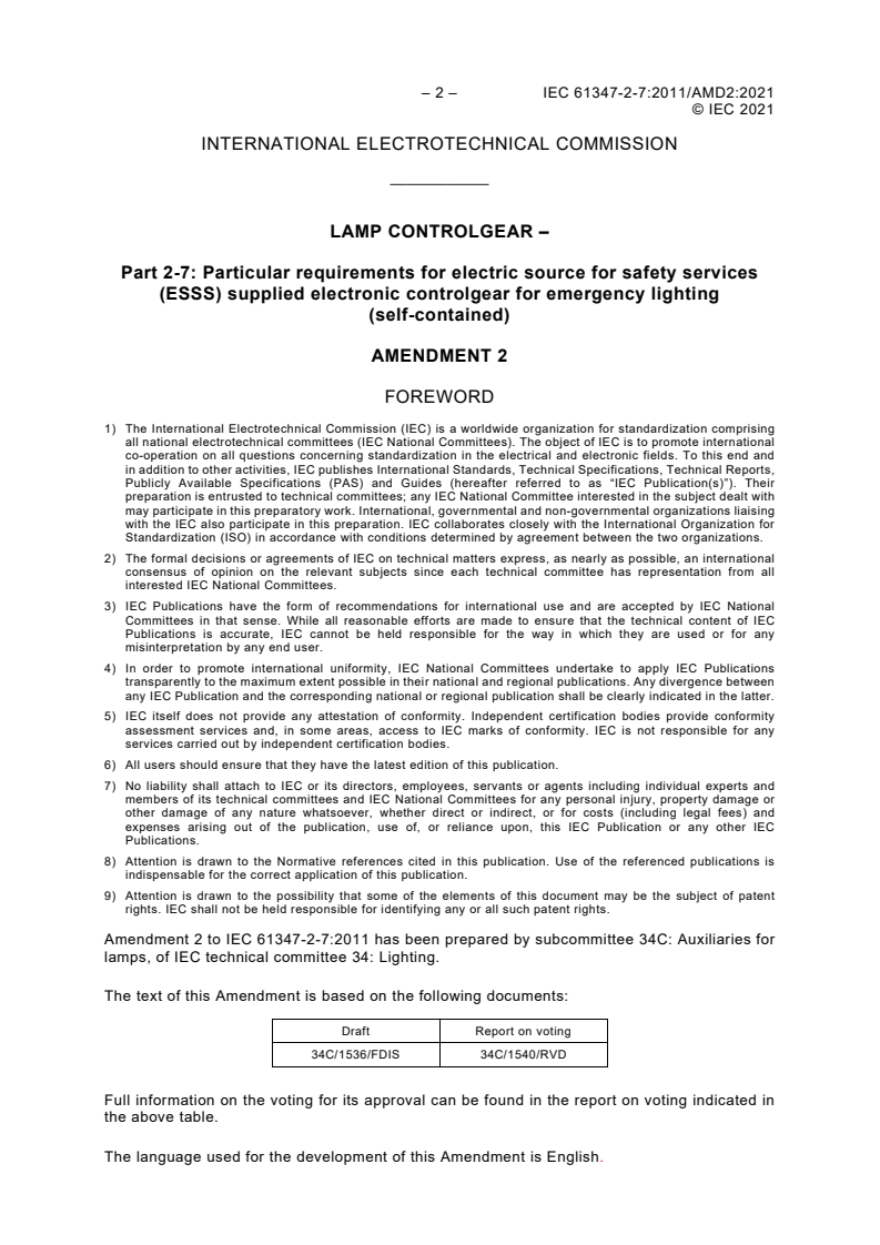 IEC 61347-2-7:2011/AMD2:2021 is an important amendment to the IEC 61347-2-7 standard, focusing specifically on lamp controlgear used in emergency lighting applications. It defines updated and particular requirements for electric source for safety services (ESSS) supplied electronic controlgear for self-contained emergency lighting systems. This amendment clarifies operational modes, introduces new technology requirements, and updates terminology and markings relevant to modern emergency lighting controlgear.