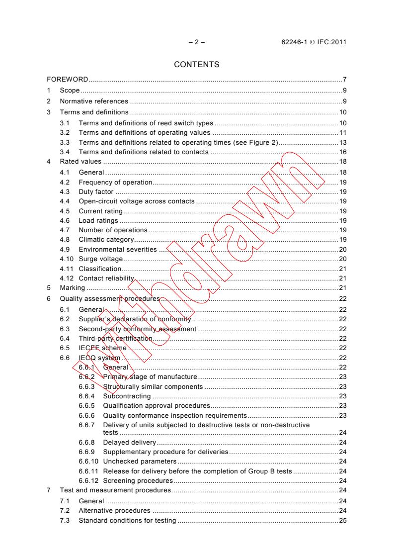 IEC 62246-1:2011 is a standard published by the International Electrotechnical Commission (IEC). Its full title is "Reed switches - Part 1: Generic specification". This standard covers: IEC 62246-1:2011 applies to all types of reed switches including magnetically biased reed switches of assessed quality for use in general and industrial applications. It lists the tests and measurement procedures which may be selected for use in detail specifications for such reed switches. It also specifies the quality assessment procedures to be followed. This new edition includes the following significant technical changes with respect to the previous one: - inclusion of the generic specifications for all types of reed switches, but mercury wetted reed switches have been removed from the scope due to their potential for environmental impact; - inclusion of three fundamental conformity assessment procedures for quality assessment.