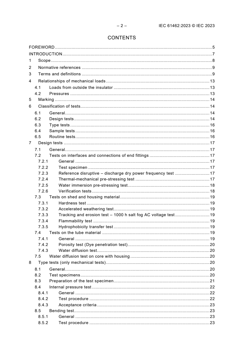 Keywords: IEC 61462:2023, composite hollow insulators, high-voltage insulators, pressurized insulators, unpressurized insulators, electrical equipment insulation, AC voltage above 1000 V, DC voltage above 1500 V, insulator testing, acceptance criteria, design recommendations, electrical safety standards, hydrophobicity test, mechanical load testing, tapered insulators.