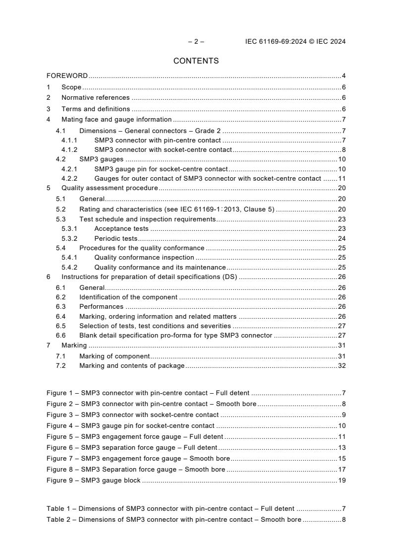 IEC 61169-69:2024, which is a sectional specification (SS), provides information and rules for the preparation of detail specifications (DS) for RF coaxial connectors with push-on coupling, typically for use in 50 Ω RF cables or micro-strips in microwave, telecommunication, wireless systems, and other fields (SMP3). It specifies mating face dimensions for general purpose connectors – grade 2, dimensional details of standard test connectors-grade 0, gauging information and tests selected from IEC 61169-1, applicable to all detail specifications relating to series SMP3 RF connectors. This specification indicates recommended performance characteristics to be considered when writing a detail specification and it covers test schedules and inspection requirements for assessment levels M and H. The SMP3 push-on coupling structure series RF coaxial connectors with the characteristic of normative impedance 50 Ω are used with various kinds of RF cables or micro-strips in microwave, telecommunication, wireless systems, and other fields. The operating frequency limit is up to 65 GHz. NOTE Imperial dimensions are the original dimensions since this is a very miniature RF connector. There is a concern that conversion to the metric system could lead to rounding errors which can lead to performance degradation from the original imperial design. The SMPM connector was released as an imperial design for this reason. All undimensioned pictorial information is for reference only.