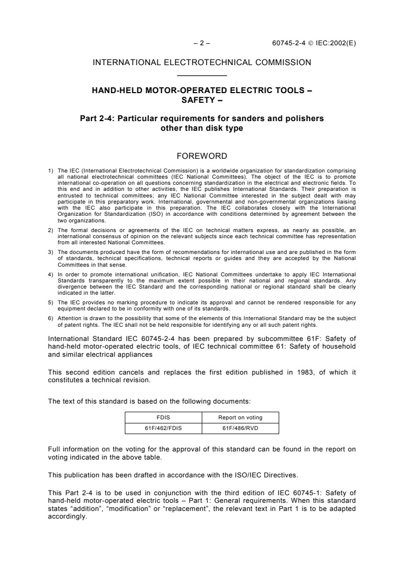 IEC 60745-2-4:2002 is an international standard developed by the International Electrotechnical Commission (IEC) focusing on the safety requirements for hand-held motor-operated electric tools, specifically sanders and polishers that are not of the disc type. This part of the IEC 60745 series complements IEC 60745-1, which covers general safety requirements for hand-held motor-operated tools, by addressing particular requirements for tools such as belt sanders, reciprocating sanders, orbital sanders, random orbit sanders, and their polishing equivalents.