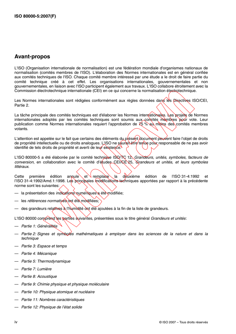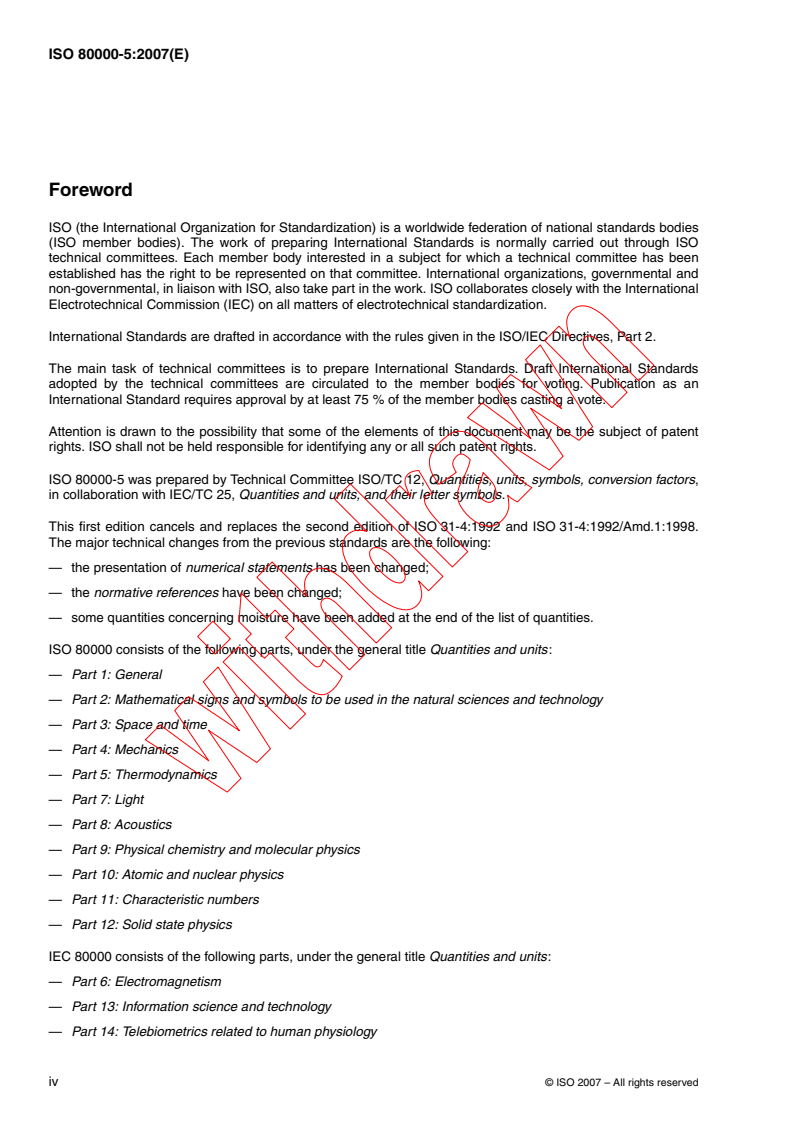 ISO 80000-5:2007 is a standard published by the International Electrotechnical Commission (IEC). Its full title is "Quantities and units - Part 5: Thermodynamics". This standard covers: ISO 80000-5:2007 gives names, symbols and definitions for quantities and units of thermodynamics. Where appropriate, conversion factors are also given.