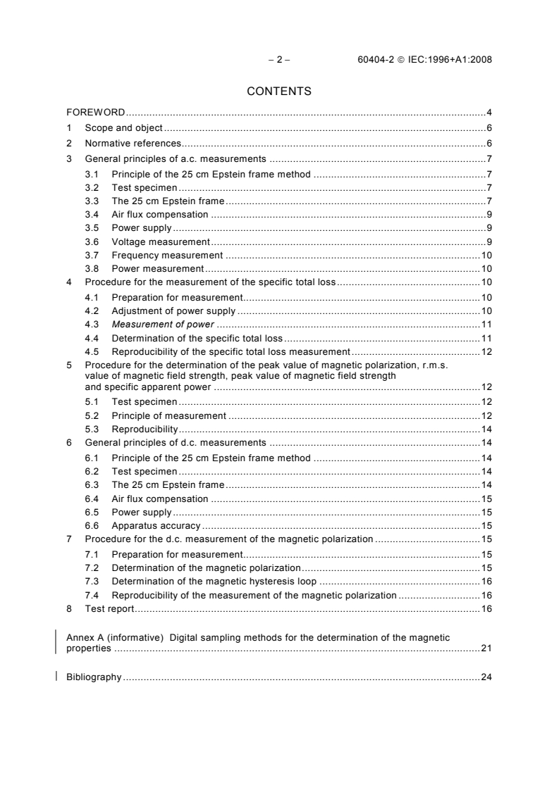 IEC 60404-2:1996 is a standard published by the International Electrotechnical Commission (IEC). Its full title is "Magnetic materials - Part 2: Methods of measurement of the magneticproperties of electrical steel sheet and strip by means of anEpstein frame". This standard covers: Applies to grain oriented and non-oriented electrical sheet and strip for a.c. measurements of magnetic properities at frequencies up to 400 Hz and for d.c. magnetic measurements. Defines the general principles and the technical details of the measurement of the magnetic properties of electrical steel sheet and strip by means of an Epstein frame. The a.c. magnetic characteristics are determined for sinusoidal induced voltages, for specified peak values of magnetic polarization and for a specified frequency.