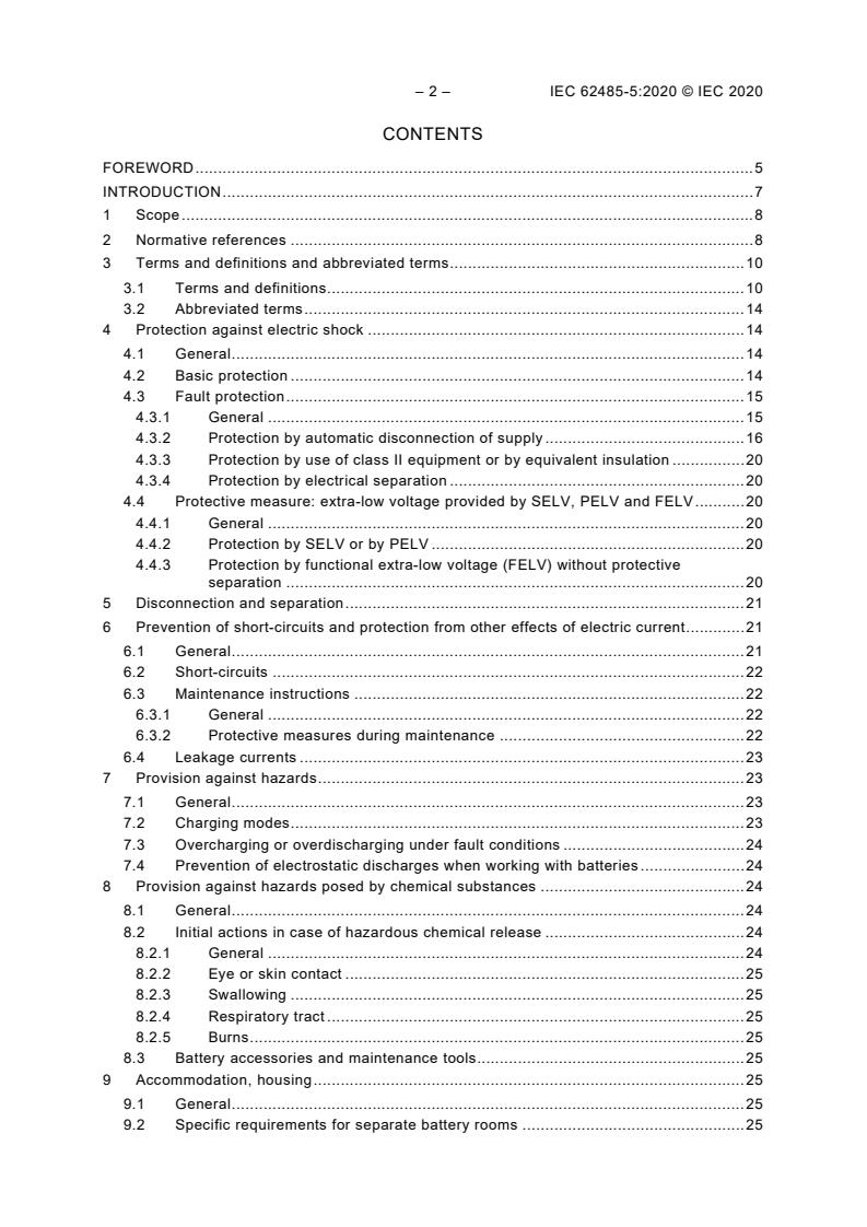 IEC 62485-5:2020 applies to the installation of one or more stationary secondary batteries having a maximum aggregate DC voltage of 1 500 V to any DC part of the power network, and describes the principal measures for protections during normal operation or under expected fault conditions against hazards generated from: