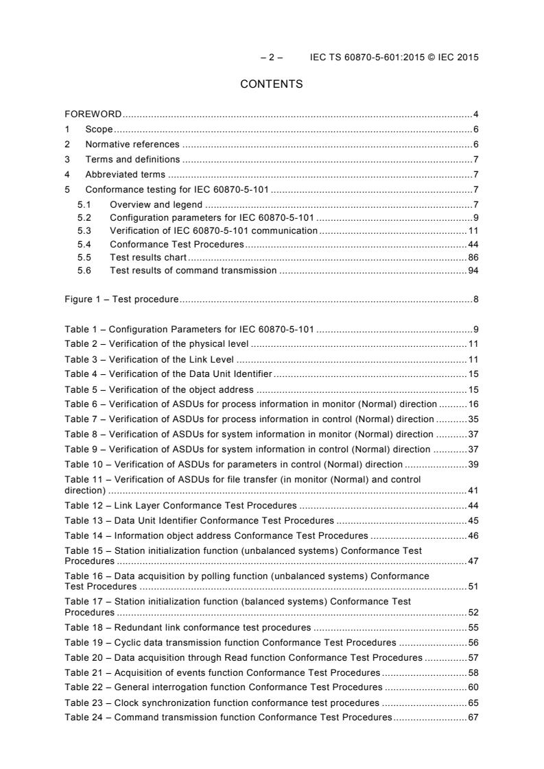 IEC TS 60870-5-601:2015 is a technical specification published by the International Electrotechnical Commission (IEC). Its full title is "Telecontrol equipment and systems - Part 5-601: Transmission protocols - Conformance test cases for the IEC 60870-5-101 companion standard". This standard covers: IEC TS 60870-5-601:2015(E) describes test cases for conformance testing of telecontrol equipment, Substation Automation Systems (SAS) and telecontrol systems, including front-end functions of SCADA. The use of this part of IEC 60870 facilitates interoperability by providing a standard method of testing protocol implementations, but it does not guarantee interoperability of devices. It is expected that using this part of IEC 60870 during testing will minimize the risk of non-interoperability. The goal of this part of IEC 60870 is to enable unambiguous and standardised evaluation of IEC 60870-5 companion standard protocol implementations. The guidelines and conditions for the testing environment are described in IEC 60870-5-6. This new edition includes the following significant technical changes with respect to the previous edition: - resolving ambiguities and inconsistencies between IEC 0870-5-101:2003 and IEC TS 60870-5-601:2006; - enhancements and optimisation of test cases which are needed to prove conformance with IEC 60870-5-101:2003. This publication is to be read in conjunction with IEC 60870-5-101:2003