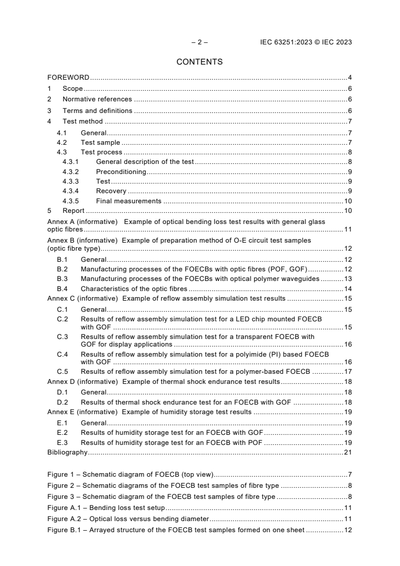 IEC 63251:2023 defines the thermal endurance test methods for reliability assessment of flexible opto-electric circuit boards. The purpose of this document is to accommodate the uniform thermal characteristics required by the flexible opto-electric circuit in high temperature environments such as automobiles. In particular, this document specifies a test method to inspect the occurrence of colour exchange, deformation and delamination of flexible opto-electric circuit boards under thermal stress.