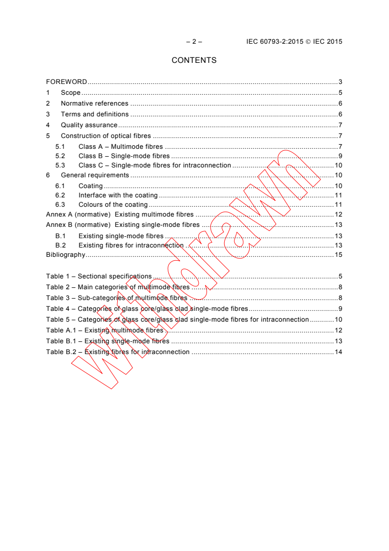 IEC 60793-2:2015 is a standard published by the International Electrotechnical Commission (IEC). Its full title is "Optical fibres - Part 2: Product specifications - General". This standard covers: IEC 60793-2:2015 contains the general specifications for both multimode and single-mode optical fibres. Sectional specifications for each of the four categories multimode fibres: A1, A2, A3, and A4 (part of the multimode fibre class A) contain requirements specific to each category. Sectional specifications for each of the two single-mode fibre classes, B and C, contain requirements common to each class. Each sectional specification includes family specifications (in normative annexes) that contain requirements for the applicable category or sub-categories. These sub-categories are distinguished on the basis of different fibre types or applications. The requirements of this standard apply to all classes. Each sectional specification contains the requirements that are common to all the family specifications that are within it. These common requirements are copied to the family specification for ease of reference. Tests or measurement methods are defined for each specified attribute. Where possible, these definitions are by reference to an IEC standard - otherwise the test or measurement method is outlined in the relevant sectional specification. This eighth edition cancels and replaces the seventh edition published in 2011. This edition constitutes a technical revision which was necessary due to the addition of new fibre models to the A1 category in IEC 60793-2-10. This edition includes the following significant technical changes with respect to the previous edition: - addition of two new sub-categories A3f and A3g indicated "under consideration" as they have not yet been fully standardized at the moment of finalizing this document; - modification of the Numerical aperture heading in Table 3 in line with recent modifications in all A1, A2, A3 and A4 multimode product specifications (NAff only). This publication is to be read in conjunction with IEC 60793-1 series. Keywords: specifications for both multimode and single-mode optical fibres