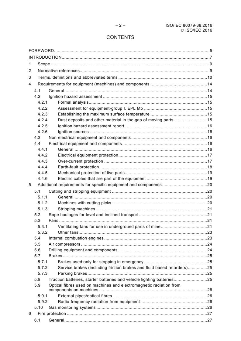 - and air with normal oxygen content, typically 21 % v/v. This part of ISO/IEC 80079 applies for equipment and components according to EPL Mb to be used in explosive atmospheres containing firedamp and/or combustible dust. For equipment and components according to EPL Ma, the requirements of this standard and of ISO 80079-36 and IEC 60079-0 apply. It is necessary to take account of external conditions to the equipment which may affect the hazard and the resultant protection measures. These measures may include ventilation, gas detection or gas drainage. This part of ISO/IEC 80079 also deals with the prevention of ignitions of explosive atmospheres caused by burning (or smouldering) of combustible material such as fabric fibres, plastic "O"-rings, rubber seals, lubricating oils or greases used in the construction of the equipment if such items could be an ignition source. For example, the mechanical failure of rotating shaft bearings can result in frictional heating that ignites its plastic cage, plastic seal or lubricating grease. Detailed requirements and test procedures for the fire protection of conveyer belts are not part of this part of ISO/IEC 80079. Keywords: explosive atmospheres in underground mines, combustible dust
