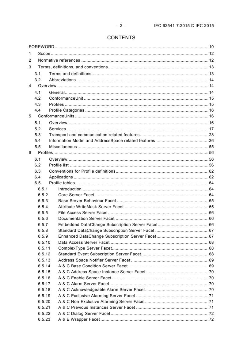 IEC 62541-7:2015 is a standard published by the International Electrotechnical Commission (IEC). Its full title is "OPC unified architecture - Part 7: Profiles". This standard covers: IEC 62541-7:2015 describes the OPC Unified Architecture (OPC UA) Profiles. The Profiles in this document are used to segregate features with regard to testing of OPC UA products and the nature of the testing (tool based or lab based). This includes the testing performed by the OPC Foundation provided OPC UA CTT (a self-test tool) and by the OPC Foundation provided Independent certification test labs. It is also defining functionality that can only be tested in an a lab and defining the grouping of functionality that is to be used when testing OPC UA products either in a lab or using automated tools. This second edition cancels and replaces the first edition published in 2012 and constitutes a technical revision. It includes the following changes: - Added a large number of new Facets to cover additional functional areas of OPC UA. Most significantly: - Facets for Historical Access; - Facets for Aggregates; - Facets for HTTPs; - New Security Facets; - New User Token Facet that supports anonymous access; - Best Practice Facets as well as New Security Policy for asymmetric key length > 2048.