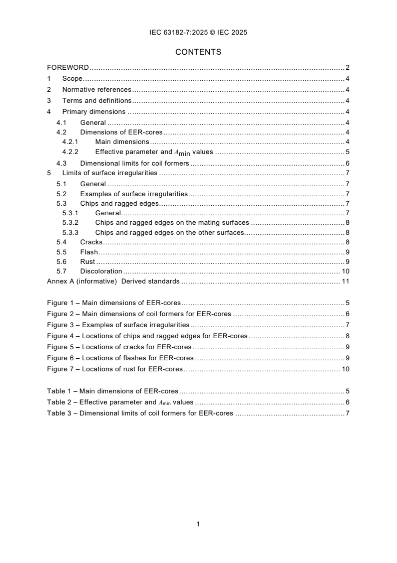 IEC 63182-7:2025 is the International Electrotechnical Commission (IEC) standard that provides comprehensive guidelines on dimensions and surface irregularities for magnetic powder cores, specifically focusing on EER-cores made from metallic magnetic powder. This part 7 of the IEC 63182 series ensures mechanical interchangeability of EER-cores and compatible coil formers through standardized dimensional specifications and defines allowable limits for surface irregularities such as chips, cracks, flashes, rust, and discoloration.