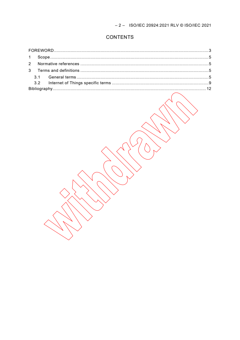 ISO/IEC 20924:2021 - "Internet of Things (IoT) - Vocabulary" is an international standard that provides a formal glossary and a terminology foundation for the IoT domain. The 2021 second edition updates and expands the first edition (2018) and supplies consistent, consensus-based definitions for general IT and IoT‑specific concepts such as IoT, IoT device, data store, interoperability, wearable device, actuator, and trustworthiness. This edition also documents editorial changes in a redline version and notes that there are no normative references in the document.
