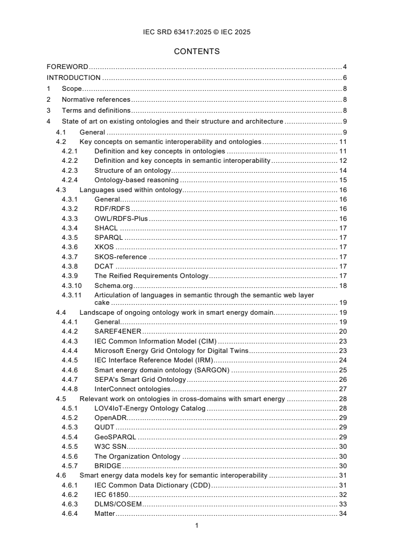 IEC SRD 63417:2025 provides guidance and a plan to develop smart energy ontologies and other domain-based ontologies within smart energy to achieve semantic interoperability through various standards, generic and specific ontologies projects. This includes but is not limited to the following. • Assessment of a selection of existing ontologies for the purpose of smart energy applications: – identification of developed ontologies within the energy sectors; – limitations, best practices, and lessons learned; – use and reuse of existing ontologies in the smart energy domain; – cross-domain semantic interoperability support and link to other ontologies. • Guidance and plan for smart energy ontologies development and usage including: – key principles to map or transform existing reference models to the IEC ontology framework; – definition of governance best practices for ontologies applied to process the smart energy domain; – guidance for developing or extending a smart energy ontology. Domain-based ontologies have been developed for semantic interoperability in a specific domain but the interaction of semantically equivalent objects in different ontologies has not been defined. This document helps users and ontology developers to define the complete relationship in different domains and different ontologies for the purpose of smart energy applications.