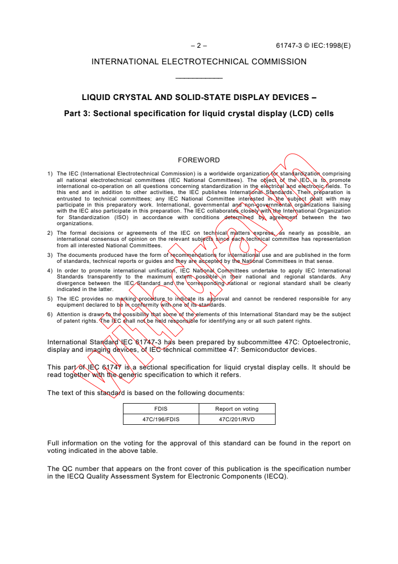 IEC 61747-3:1998 is a standard published by the International Electrotechnical Commission (IEC). Its full title is "Liquid crystal and solid state display devices - Part 3: Sectional specification for liquid crystal display (LCD) cells". This standard covers: Applies to liquid crystal cells of the segment type monochrome liquid crystal display cells. It gives details of the quality assessment procedures, the inspection requirements, screening sequences, sampling requirements and test and measurement procedures required for the assessment of liquid crystal display cells. Instead of the qualification approval procedure, it is allowed to apply the capability approval procedure.