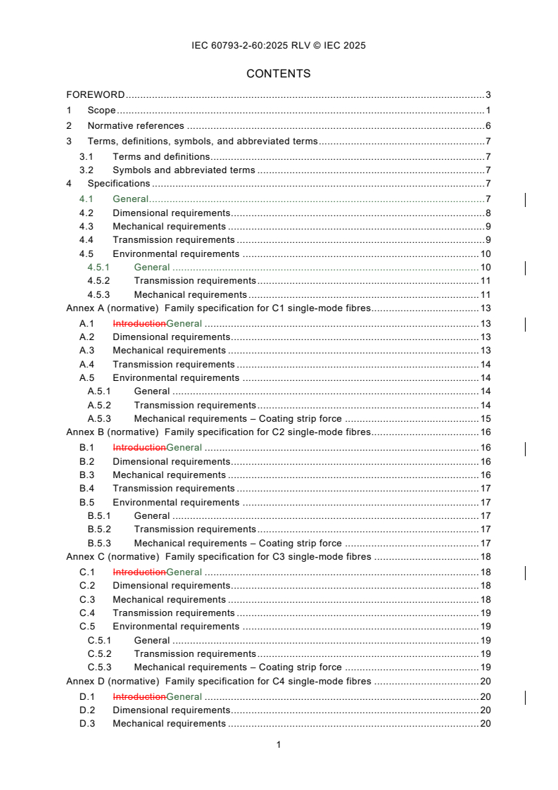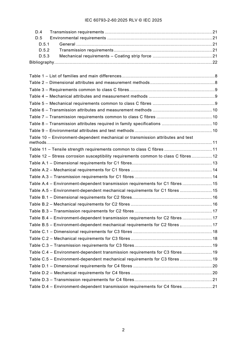 IEC 60793-2-60:2025 is applicable to optical fibre types C1, C2, C3, and C4, as described in Table 1. These fibres are used for the interconnections within or between optical components systems and are optimized to support dense optical connectivity. While the fibres can be overcoated or buffered for the purpose of making protected pigtails, they can be used without overcoating. They can, however, be colour coded. This second edition cancels and replaces the first edition published in 2008. This edition constitutes a technical revision. This edition includes the following significant technical changes with respect to the previous edition: a) replacement of "intraconnection" with "interconnection" and addition of the definition of "interconnection fibres"; b) modification of the nominal MFD limit of C1 fibres; c) addition of "Primary coating diameter-coloured" limits for class C fibres and change of "Primary coating diameter-uncoloured" limits for class C_80 fibres; d) change of coating strip force limits for class C1, class C2, and class C3 fibres; e) replacement of "Fibre cut-off wavelength" with "Cable cut-off wavelength" and revision of "Note b" in Table 6; f) replacement of "Fibre cut-off wavelength" with "Cable cut-off wavelength" and deletion of the "Note" in Table 8; g) addition of 200 μm coating diameter requirements for C1_125 fibres and change of coating diameters limits for C1_80 fibres in Table A.1; h) addition of 200 µm coating diameter requirements for C1_125 fibres and change of coating strip force limits in Table A.2 and in Table A.5; i) replacement of "Fibre cut-off wavelength" with "Cable cut-off wavelength", modification of the "Cable cut-off wavelength" limit and addition of a new "Note" in Table A.3; j) addition of a transmission requirements at 1 625 nm and deletion of 1 310 nm for C1 fibres in Table A.4; k) modification of "Fibre cut-off wavelength" limits of C3 fibres in Table C.3; l) replacement of "Fibre cut-off wavelength" with "Cable cut-off wavelength" for C4 fibres in Table D.3.