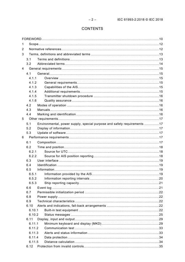 IEC 61993-2:2018 specifies the minimum operational and performance requirements, methods of testing and required test results conforming to performance standards adopted by IMO in Resolution MSC.74(69):1998, Annex 3. This document incorporates the applicable technical characteristics of Class A shipborne equipment included in Recommendation ITU-R M.1371 and takes into account the ITU Radio Regulations, where applicable. In addition, it takes account of IMO Resolution A.694(17) to which IEC 60945 is associated. When a requirement in this document is different from IEC 60945, the requirement of this document takes precedence. This document also specifies the minimum requirements both for the means to input and display data and for the interfaces to other equipment suitable to be used as means of input and display data. This third edition cancels and replaces the second edition published in 2012. This edition constitutes a technical revision. This edition includes the following technical changes with respect to the previous edition: a) it incorporates the technical characteristics included in Recommendation ITU R M.1371-5:2014; b) it introduces the concept of locating device groups in order to include EPIRB AIS and MOB AIS in addition to AIS SART; c) it adds security features for configuration input by introducing a new sentence SSA; d) it adds optional implementation of IEC 61162-450/460 interfaces; e) it adds requirements for bridge alert management (BAM); f) it introduces extended dimension values used by towing vessels; g) it adds a software update requirement.