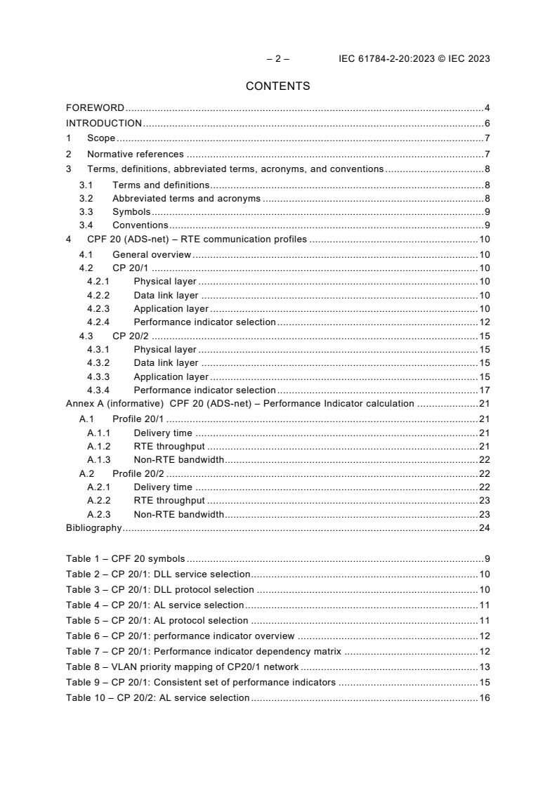IEC 61784-2-20:2023 defines Communication Profile Family 20 (CPF 20). CPF 20 specifies a set of Real-Time Ethernet (RTE) communication profiles (CPs) and related network components based on the IEC 61158 series (Type 25), ISO/IEC/IEEE 8802-3 and other standards. For each RTE communication profile, this document also specifies the relevant RTE performance indicators and the dependencies between these RTE performance indicators. NOTE 1 All CPs are based on standards or draft standards or International Standards published by the IEC or on standards or International Standards established by other standards bodies or open standards processes. NOTE 2 The RTE communication profiles use ISO/IEC/IEEE 8802-3 communication networks and its related network components and in some cases amend those standards to obtain RTE features.