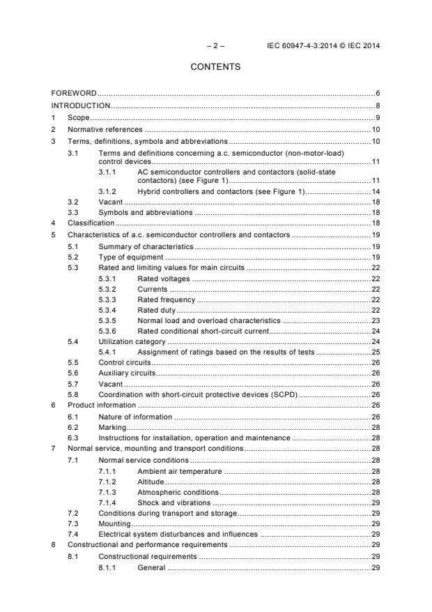 IEC 60947-4-3:2014 applies to a.c. semiconductor non-motor load controllers and contactors intended for performing electrical operations by changing the state of a.c. electric circuits between the ON-state and the OFF-state. Typical applications are classified by utilization categories given in Table 2. This second edition cancels and replaces the first edition published in 1999, Amendment 1:2006 and Amendment 2:2011. This edition constitutes a technical revision. This edition includes the following significant technical changes with respect to the previous edition: a) Update of the marking requirements (6.1); b) Update of the EMC requirements (8.3.2); and c) Update of the tests requirements (9.3.1, 9.4, 9.4.1.1, 9.4.1.2, 9.4.2.1, 9.4.2.2, 9.4.2.3, 9.4.2.4, 9.4.2.6). This publication is to be read in conjunction with IEC 60947-1:2007.