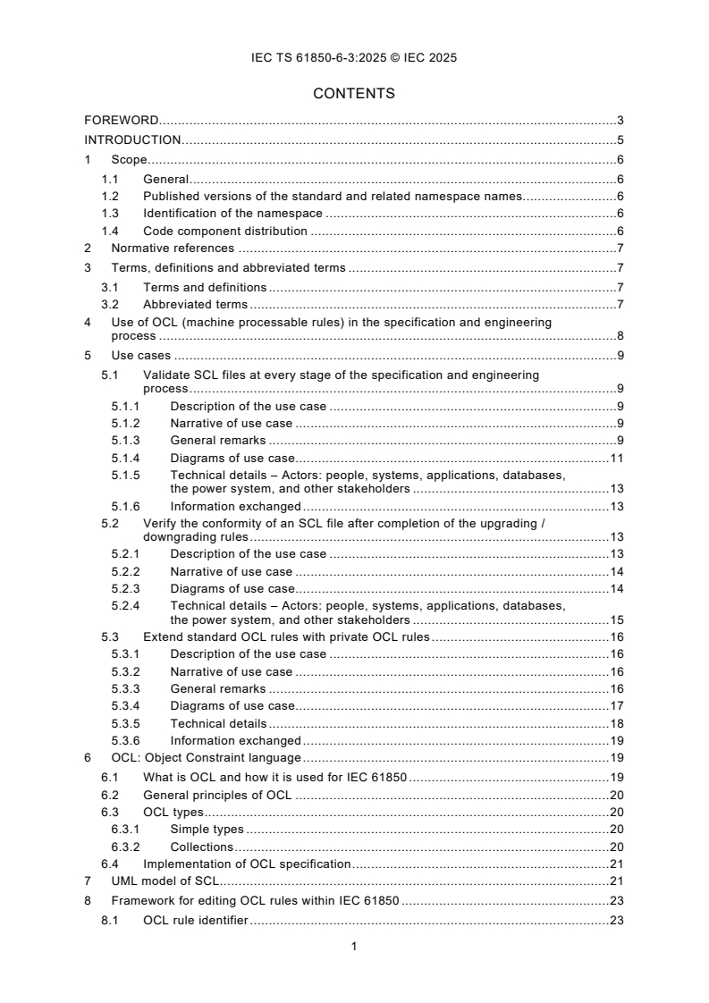IEC TS 61850-6-3:2025, which is a Technical Specification, describes how to use and define formal rules, in a machine-processable format: OCL, that can be imported and interpreted by tools. The following main use cases are supported: – Validate SCL files at every stage of the specification and engineering process; – Verify the conformity of a SCL file after completion of the upgrading/downgrading rules; – Extend standard OCL rules with private OCL rules The purpose of this document is limited to the publication of the format and method to write correct and structured rules. The rules themselves are published as code components of the corresponding IEC 61850 parts.