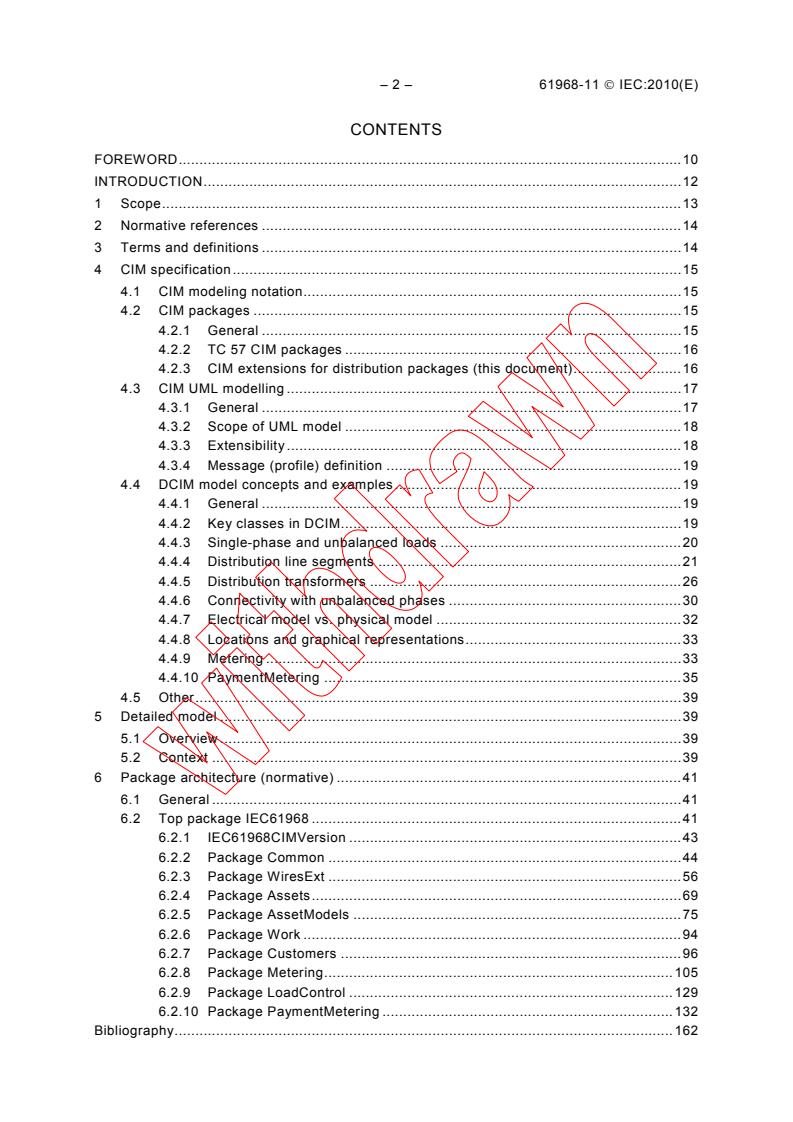 IEC 61968-11:2010(E) specifies the distribution extensions of the Common Information Model (CIM) specified in IEC 61970-301. It defines a standard set of extensions of common information model, which support message definitions in Parts 3 to 9 of IEC 61968, IEC 61968-13 and IEC 61968-14. The scope of this document is the information model that extends the base CIM for the needs of distribution networks, as well as for integration with enterprise-wide information systems typically used within electrical utilities. The information model is defined in UML which is platform-independent and electronically processable language that is then used to create message payload definitions in different required formats.