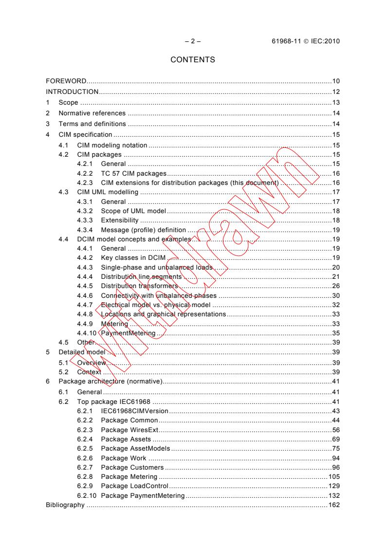 IEC 61968-11:2010 is a standard published by the International Electrotechnical Commission (IEC). Its full title is "Application integration at electric utilities - System interfaces for distribution management - Part 11: Common information model (CIM) extensions for distribution". This standard covers: IEC 61968-11:2010(E) specifies the distribution extensions of the Common Information Model (CIM) specified in IEC 61970-301. It defines a standard set of extensions of common information model, which support message definitions in Parts 3 to 9 of IEC 61968, IEC 61968-13 and IEC 61968-14. The scope of this document is the information model that extends the base CIM for the needs of distribution networks, as well as for integration with enterprise-wide information systems typically used within electrical utilities. The information model is defined in UML which is platform-independent and electronically processable language that is then used to create message payload definitions in different required formats.
