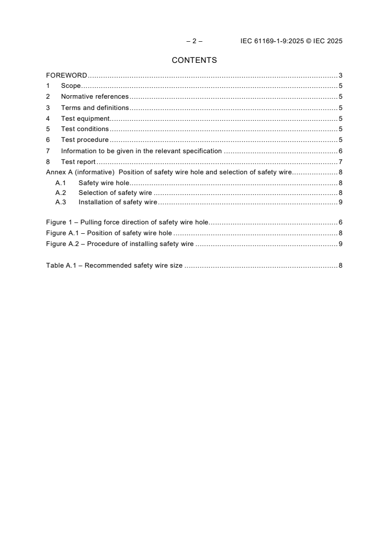 The document establishes a standardized test procedure to measure the mechanical strength and reliability of the safety wire hole under specified pulling forces. By providing uniform testing guidelines, IEC 61169-1-9:2025 ensures enhanced product safety, durability, and quality assurance for manufacturers and users of RF connectors globally.