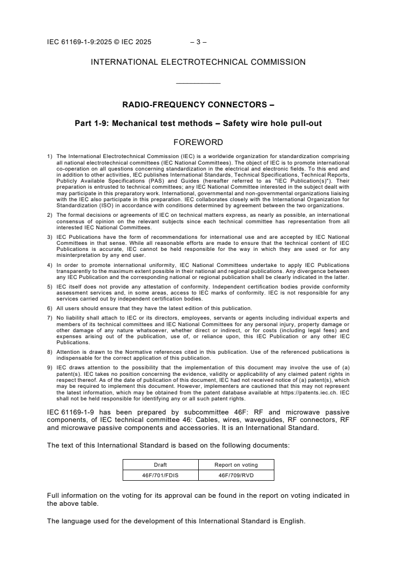 IEC 61169-1-9:2025 provides a precise and practical framework for testing the mechanical durability of safety wire holes in RF connectors. By applying consistent pull-out test methods, this standard ensures that RF connectors can withstand operational mechanical stresses, safeguarding connectivity and performance across communications and electronic applications. Manufacturers, testers, and users benefit from the enhanced safety, reliability, and international harmonization offered by compliance with this standard.